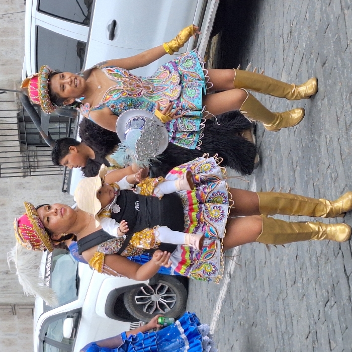 Two women in vibrant, ornate dresses, gold gloves, and matching gold boots participate in a parade. One woman carries a baby in a carrier, while the other extends an arm outward. A boy in dark clothing stands between them, and a person in a blue dress stands partially in the bottom left corner. White cars are visible in the background, along with a brick walkway.