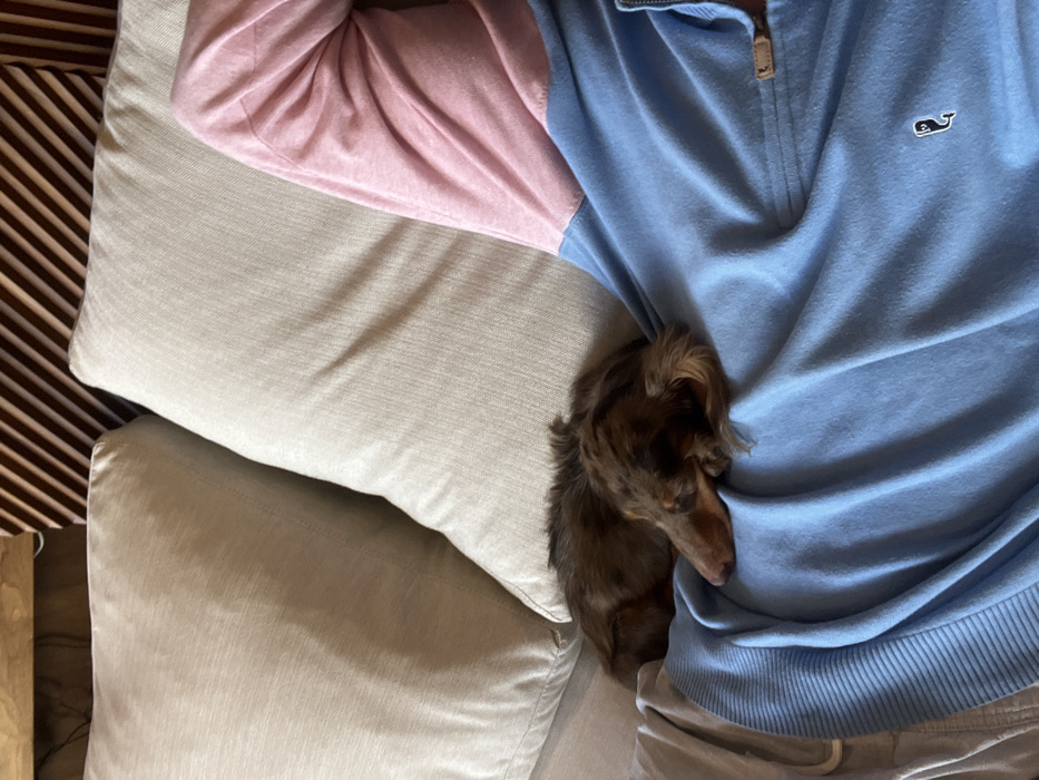 A small, long-haired dachshund nestled in the chest of a person wearing a light blue quarter-zip sweater with a small whale logo. The person's left arm, clad in a pink long-sleeve shirt, rests on a light beige pillow. Additional pillows are visible behind the arm, and a wooden panel with a striped pattern is at the image's edge. The dog appears to be sleeping or resting comfortably.