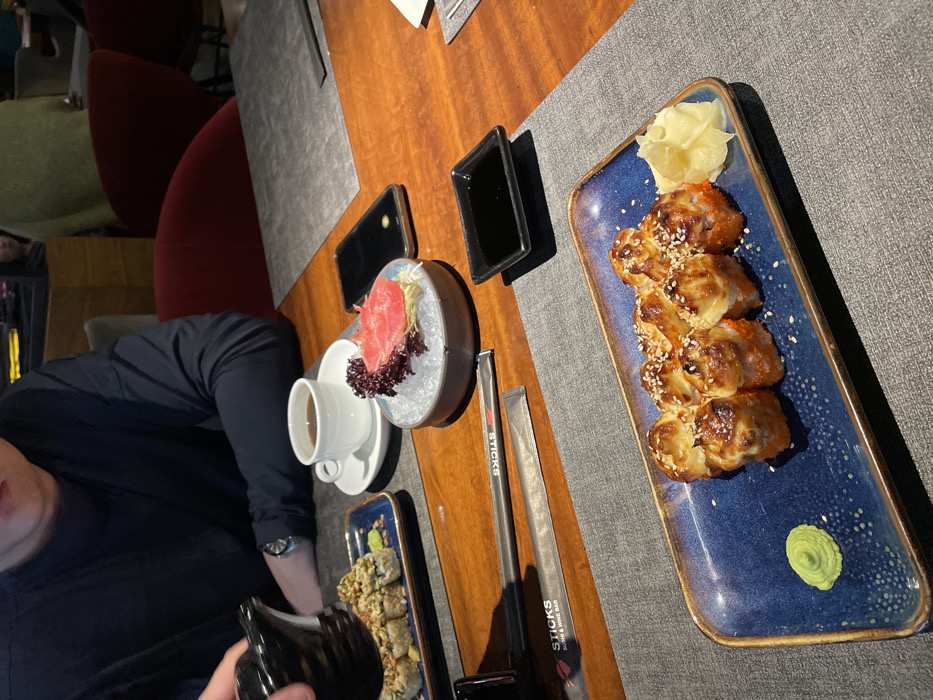 A table setting includes sushi rolls arranged on blue dishes, accompanied by ginger, wasabi, and soy sauce containers. A cup and saucer sit near a dish with raw fish and seaweed. Chopsticks are positioned between the dishes. A person wearing a dark shirt appears in the lower-left corner, holding a dark container. The table is a mix of wood and gray surfaces.
