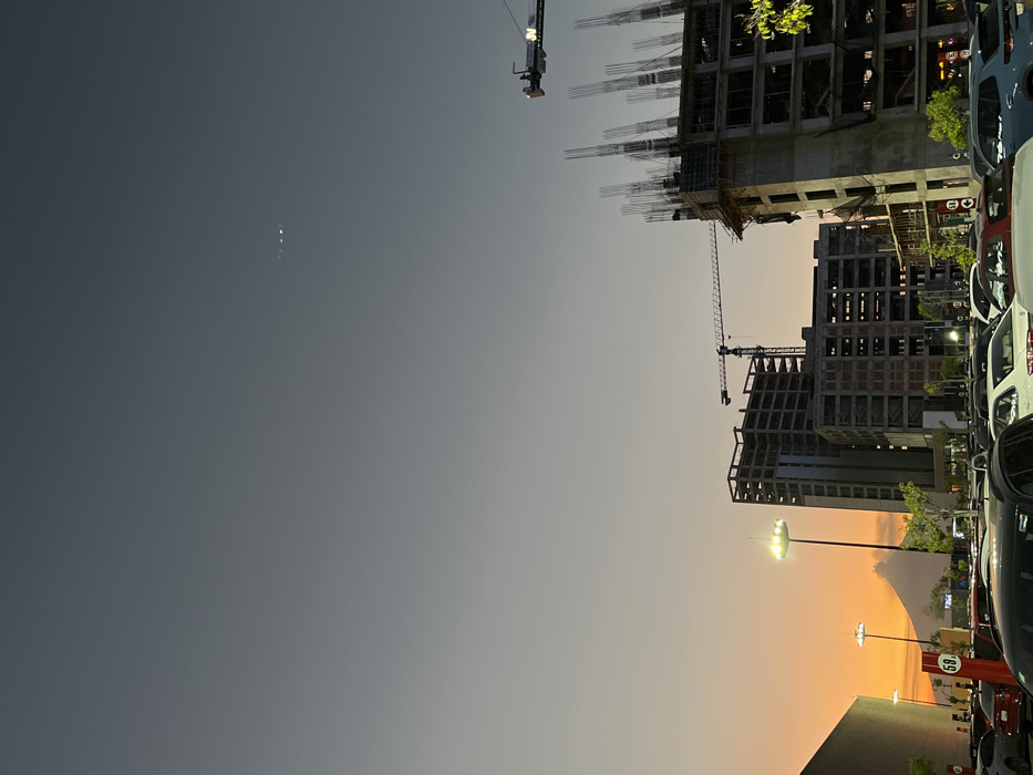 The photo depicts a construction site against a twilight sky. Several unfinished buildings, partially illuminated, stand alongside construction cranes. A row of parked cars lines the right edge of the frame. The sky transitions from a dark gray to an orange hue near the horizon, indicating either sunrise or sunset. Streetlights are also visible.