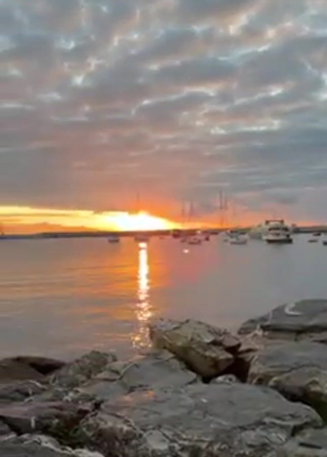 sunset over the ocean. In the foreground, there are rocks. In the background, there are boats in the water and hills in the distance. The sky is cloudy and the sun is setting, casting a golden light over the scene. The video pans to the right, revealing a town on the shoreline. The buildings are lit by the setting sun.