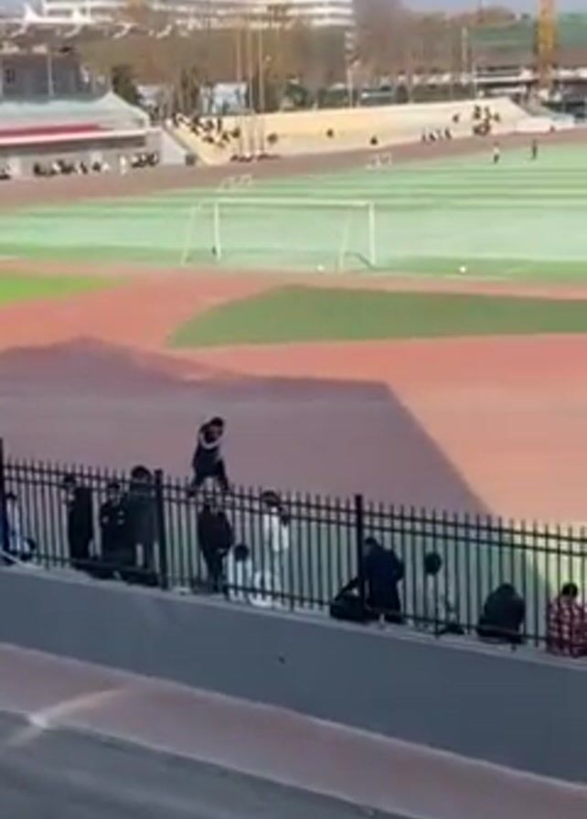 n outdoor sports complex, likely a school or university field, with a red running track surrounding a green turf field. The field is marked with white lines for soccer or a similar sport. Several individuals are visible on the field, some of whom appear to be running or playing. A black metal fence separates the viewer's perspective from the sports field. Several people are either standing, sitting, or walking along the fence line, appearing to observe the activities on the field. In the background are buildings, including a larger structure that appears to be a stadium or gymnasium. Construction cranes are visible, indicating ongoing development in the area. The weather appears to be sunny.