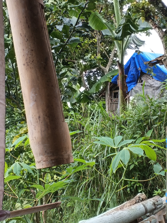 Lush greenery fills the frame, highlighting a rustic scene. A large bamboo pole stands prominently on the left. In the background, a weathered wooden structure is visible, partially covered by a blue tarp. Wild grasses and plants flourish, obscuring the lower portion of the hut. Scattered pieces of bamboo lie near the base of the frame, blending into the overgrown vegetation. The overall impression is one of natural abundance and rural living.