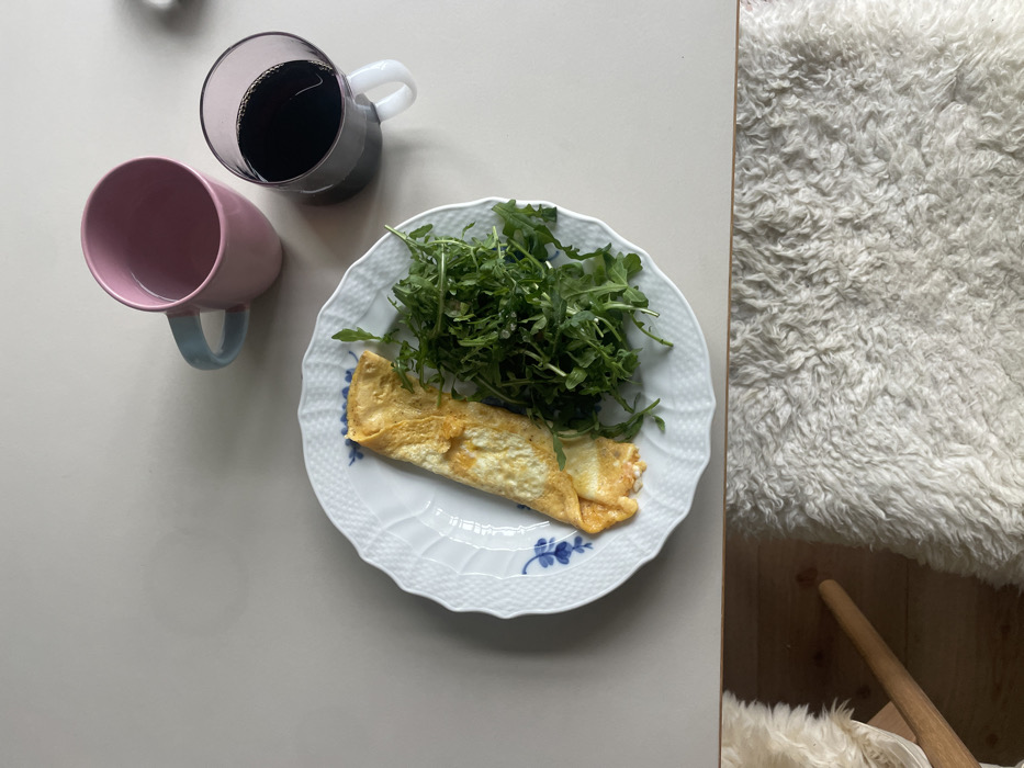 An overhead view depicts a meal set on a light beige table surface. A white, scalloped-edge plate, featuring blue floral patterns consistent with Royal Copenhagen designs, holds a folded yellow omelet and a mound of fresh green leafy salad. To the right of the plate, two mugs are present: a pink ceramic mug with a light blue handle containing a clear liquid, and a translucent dark grey/purple glass mug with a white handle containing a dark liquid, consistent with coffee. The lower portion of the image reveals a segment of an off-white shag rug, beneath which a light wooden floor and a partial wooden furniture leg are visible. No individuals are depicted. No specific visual elements within the image identify a location in Copenhagen, Denmark.