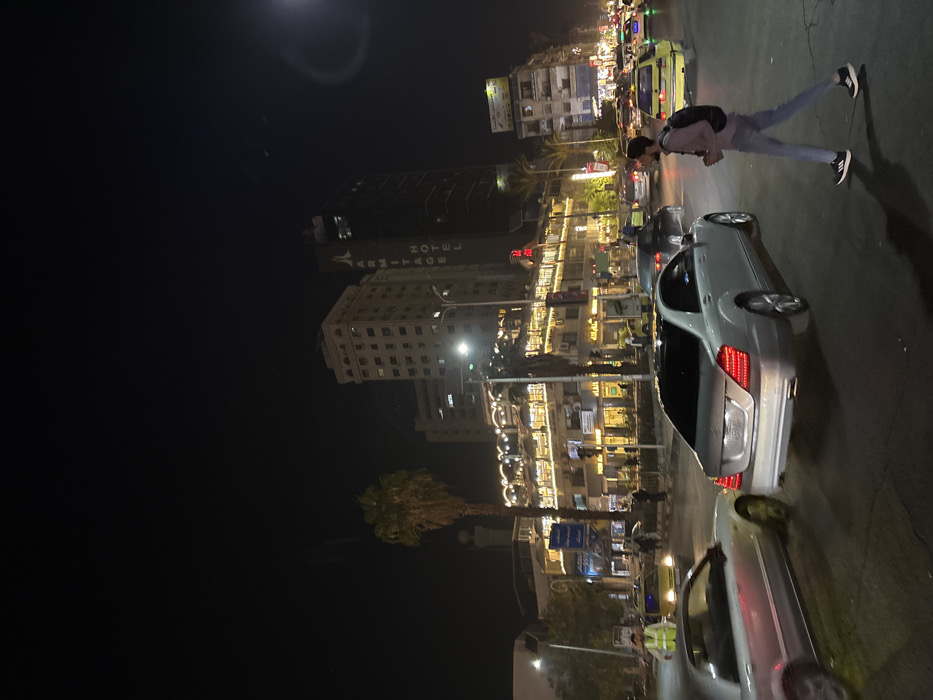 The image depicts a nighttime urban street scene in Al-Muhajerin Municipality, Damascus, Syria, characterized by artificial illumination. In the background, two prominent multi-story buildings are visible. The taller, darker building on the right features a vertically oriented sign displaying "ARMITAGE HOTEL." To its left, a lighter-colored, multi-story building stands. Below these, a complex of lower commercial buildings is heavily illuminated with numerous window lights and decorative string lights. Multiple palm trees are interspersed throughout the scene, with one tall specimen centrally located in the mid-ground. The foreground and mid-ground feature a busy street. A silver Mercedes-Benz S-Class sedan is positioned centrally in the mid-ground, facing away from the viewer, with its red taillights illuminated. To the left, a portion of a lighter-colored sedan is visible, appearing to move from left to right. Further down the street, numerous other vehicles, including several yellow taxis, are present in traffic lanes. On the right side of the foreground, a male pedestrian walks from right to left across the street. He wears a light-colored long-sleeve shirt, dark pants, and dark sneakers with white soles, carrying a dark backpack. In the left mid-ground, another male individual wearing a yellow high-visibility vest stands near a yellow taxi. Additional pedestrians are visible on sidewalks and crossing the street further into the background. The sky is dark, indicating night, with a distinct lens flare in the upper right quadrant.