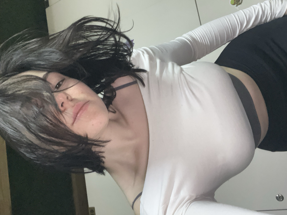 The image depicts an indoor scene located in Lymanka, Ukraine. A female subject occupies the central foreground, positioned as if for a portrait photograph. She has short to medium length dark hair, part of which falls across her face, partially obscuring her forehead and right eye. Her left eye, nose, and full lips are visible. The subject is attired in a light-colored, off-the-shoulder, long-sleeved top. A dark-colored bra strap is visible over her left shoulder. Below the top, a dark band-style garment is visible, transitioning to black lower body attire. The background primarily consists of light-colored walls or cabinetry. A darker, horizontal element is positioned in the upper left, with a lighter rectangular object directly beneath it. A small green object is present in the upper right. On the lower left background, a light-colored circular object with a dark central point is affixed to a surface.