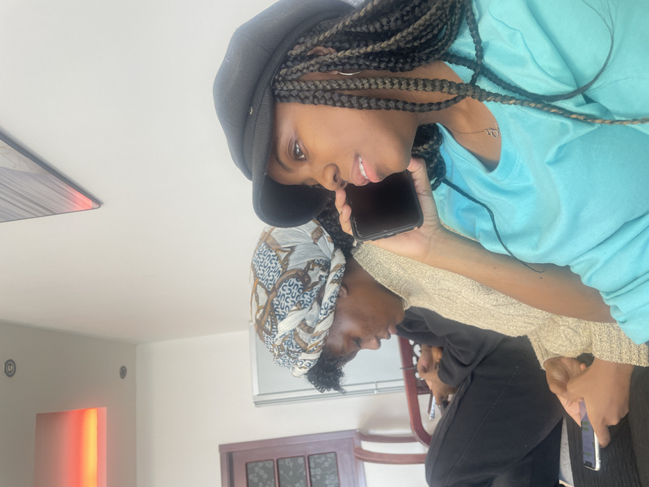 Two Black women are indoors. One woman wears a black cap and a blue top, holding a smartphone to her ear. Her hair is styled in braids. The other woman wears a patterned headscarf and a beige sweater. She's seated, holding her own phone. There's a wooden chair behind her. The room has white walls, a colored light fixture, and a dark wooden door.