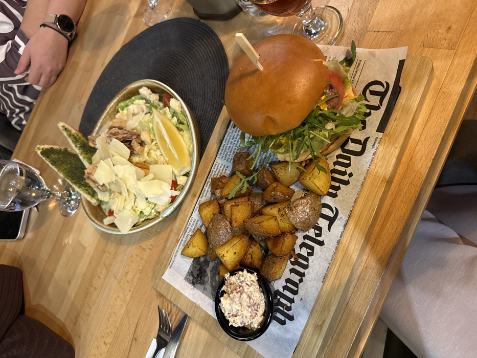 The image depicts a dining scene at a restaurant in the city of Razlog, Bulgaria, observed from an overhead perspective. Two individuals are partially visible at a light wooden table. On the left, a person's upper arm and shoulder, clad in a brown long-sleeved garment, are present. On the right, a hand and forearm, wearing a light-colored top with dark stripes and a wristwatch with a dark strap and light face, rest on the table. A third person's light-colored leg or thigh is visible beneath the table in the lower left. In the foreground, a light wooden serving board is placed on the table, lined with a sheet of paper resembling a newspaper print, specifically "The Daily Telegraph". This board holds a hamburger with a brioche bun, a visible patty, lettuce, tomato, and arugula, secured by a wooden skewer. Alongside the hamburger is a pile of roasted potato chunks and a small black ramekin containing a creamy, reddish-speckled coleslaw or salad. In the background, on a dark circular woven placemat, a bowl contains a salad, appearing to be a Caesar salad, composed of lettuce, croutons, shaved Parmesan cheese, a protein (likely chicken or fish), and garnished with a lemon wedge. Two slices of bread topped with a green spread are inserted upright into the salad. Beverages include a clear wine glass filled with water positioned centrally on the table, and a glass containing a brown liquid, possibly beer, partially visible on the far right. A set of cutlery, consisting of a fork and knife, is located on the left side of the table. A smartphone is partially visible between the water glass and the person on the left. The overall environment suggests an indoor restaurant setting.