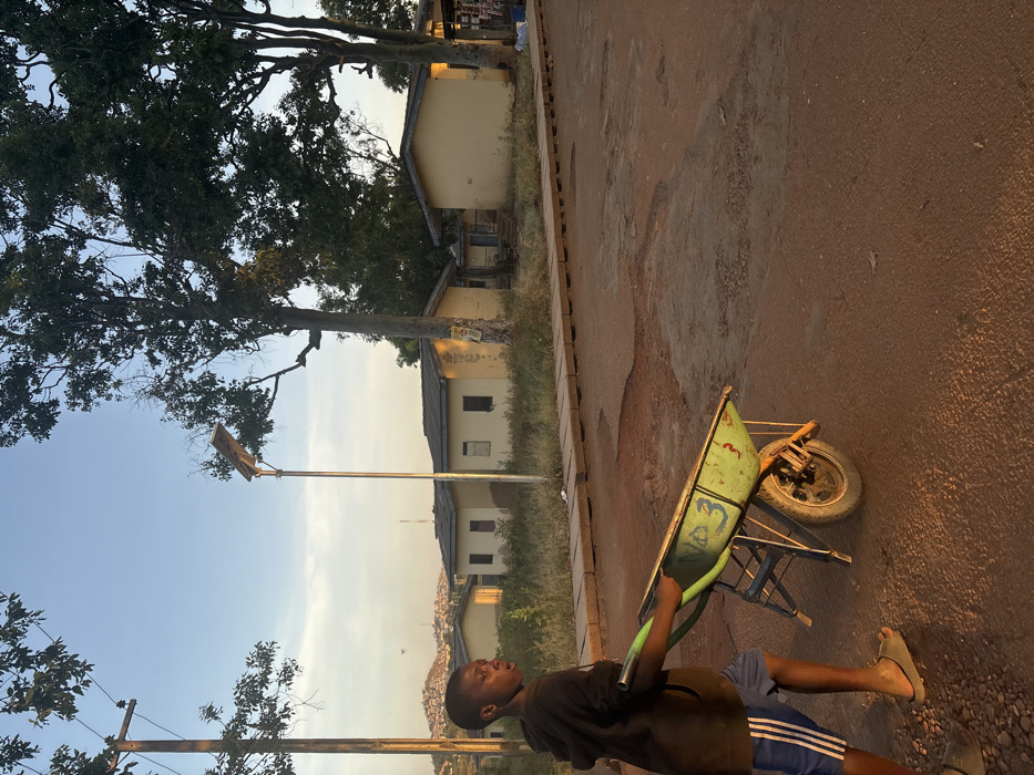 A young male, likely adolescent, with dark skin, dressed in a dark hooded shirt, blue shorts with white vertical stripes, and light-colored flip-flops, pushes a faded green metal wheelbarrow marked "No. 3" with a single wheel across an unpaved, reddish-brown dirt road. He is positioned on the left side of the frame, looking towards the left. The road exhibits several potholes and uneven surfaces. In the mid-ground, a low concrete border separates the road from an expanse of dry grass and scattered residential structures. These are single-story, light-colored (tan) buildings with dark roofs, appearing somewhat weathered. Large trees with dense green foliage dominate the right side of the frame and extend into the background. A tall utility pole with wires stands on the far left, and a modern solar-powered street light is prominently located in the mid-ground. In the distant background, hills covered with additional structures are visible under a pale blue sky, indicating the wider area of Rafin Par, Nigeria. The scene is illuminated by warm, low-angle natural light, casting soft shadows.