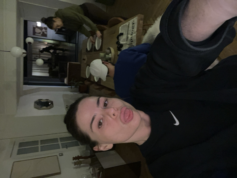 selfie of a woman sticking her tongue out. She wears a black Nike sweatshirt. Behind her, two other people are at a dining table. One is placing plates on the table, and another wears a white cap. A "typology" box sits on the table. Through the window, there is a chandelier. The image appears to be taken indoors, with a door and artwork visible in the background.