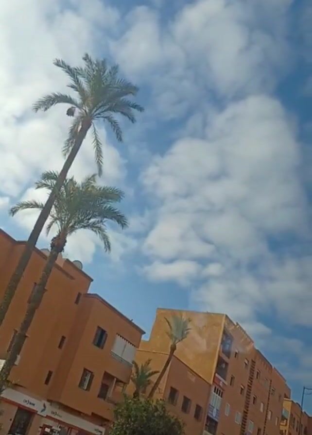 view from inside a moving vehicle, likely a car, looking up at orange buildings and palm trees against a backdrop of a bright blue sky filled with fluffy white clouds