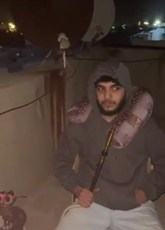 young man sitting on a chair on a rooftop at night. He is wearing a gray hoodie and light blue jeans. He has a patterned travel pillow around his neck. He is holding the hose of a hookah. In the background, there are two satellite dishes, mugs on the ledge of the roof, and a view of city lights at night.