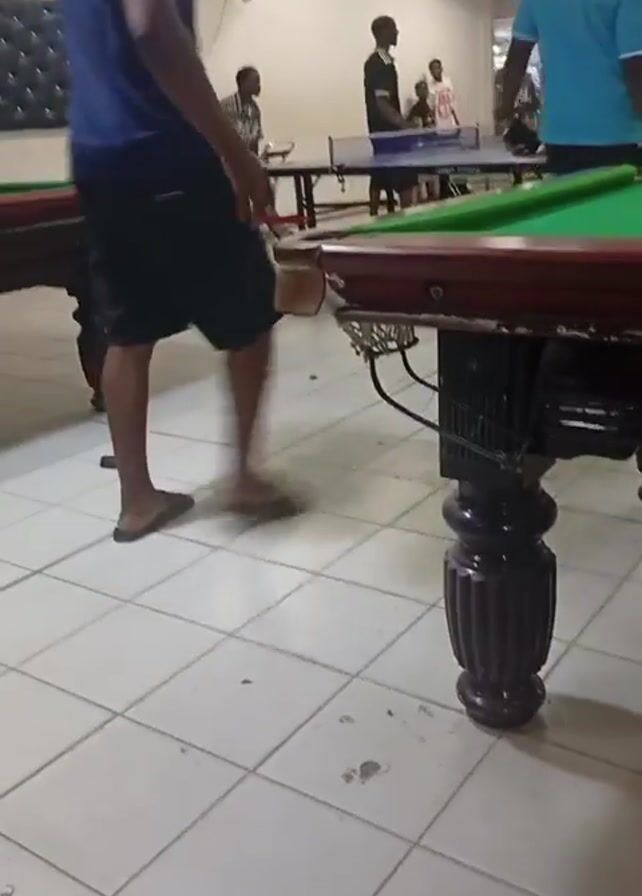 interior of what appears to be a billiards hall. Several people are present, some standing and others possibly playing pool. Pool tables with green felt are visible. The room is lit by overhead fluorescent lights and has a tile floor. The camera is moving. One person wearing a blue shirt walks across the room. The video is somewhat blurry.