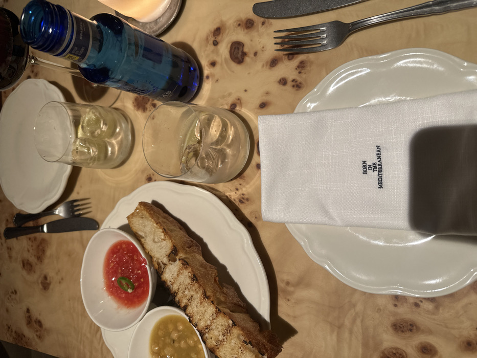- "An overhead shot shows a table setting with a blue glass water bottle, glasses with ice, a bread basket containing a long loaf and two dipping sauces (one red, one beige), a knife and fork, two plates, and a napkin on one plate that reads "BORN IN THE MEDITERRANEAN"" by FM-fbKUu1, licensed under CC BY 4.0