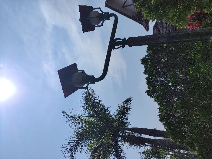 - "The image displays an outdoor scene under bright midday sunlight, characterized by a clear blue sky with sparse, wispy white clouds and a visible sun creating lens flare in the upper left" by FM-sO6Wu2, licensed under CC BY 4.0