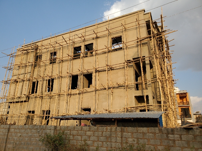 The image depicts a multi-story building under construction in Jiru, Nigeria
