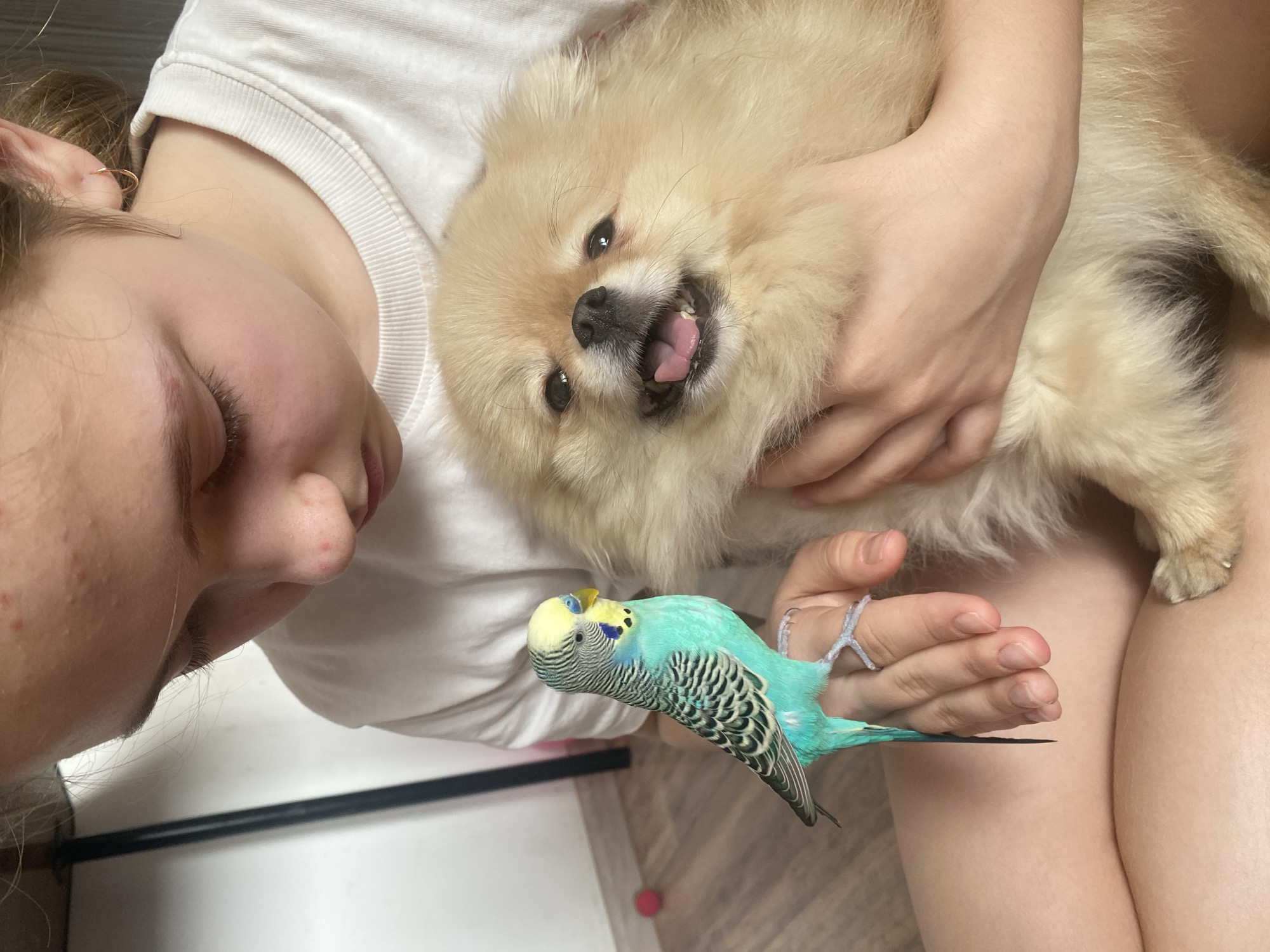 A person with light skin is holding a fluffy, tan-colored Pomeranian dog in their arms. The dog is looking at the camera with its mouth open, tongue visible, and has a happy expression. In the same hand holding the dog, a small blue and black parakeet is perched on the fingers. The person is wearing a white t-shirt and light-colored shorts. The background is out of focus, but a white surface with a black edge and a small pink ball are visible. The setting appears to be indoors.
