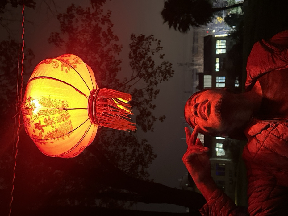 The scene depicts an outdoor nighttime environment in Jiangjin, China. A large, illuminated Chinese lantern, predominantly red with yellow sections, hangs centrally in the upper frame, casting a strong red light downwards. The lantern displays intricate gold-colored decorative patterns and Chinese characters, including "平安" (Píng'ān), and has red tassels hanging from its base. Below the lantern, a person, appearing male, is positioned with their head tilted upwards, eyes closed, directly illuminated by the lantern's red glow. Their right hand is raised with the index and middle fingers extended in a V-shape near the right side of their face. The person wears a dark, possibly quilted, jacket. In the background, dark foliage from trees is visible, along with multiple-story buildings featuring illuminated windows, and faint power lines or utility structures against the dark sky. A palm tree is also identifiable on the far right.