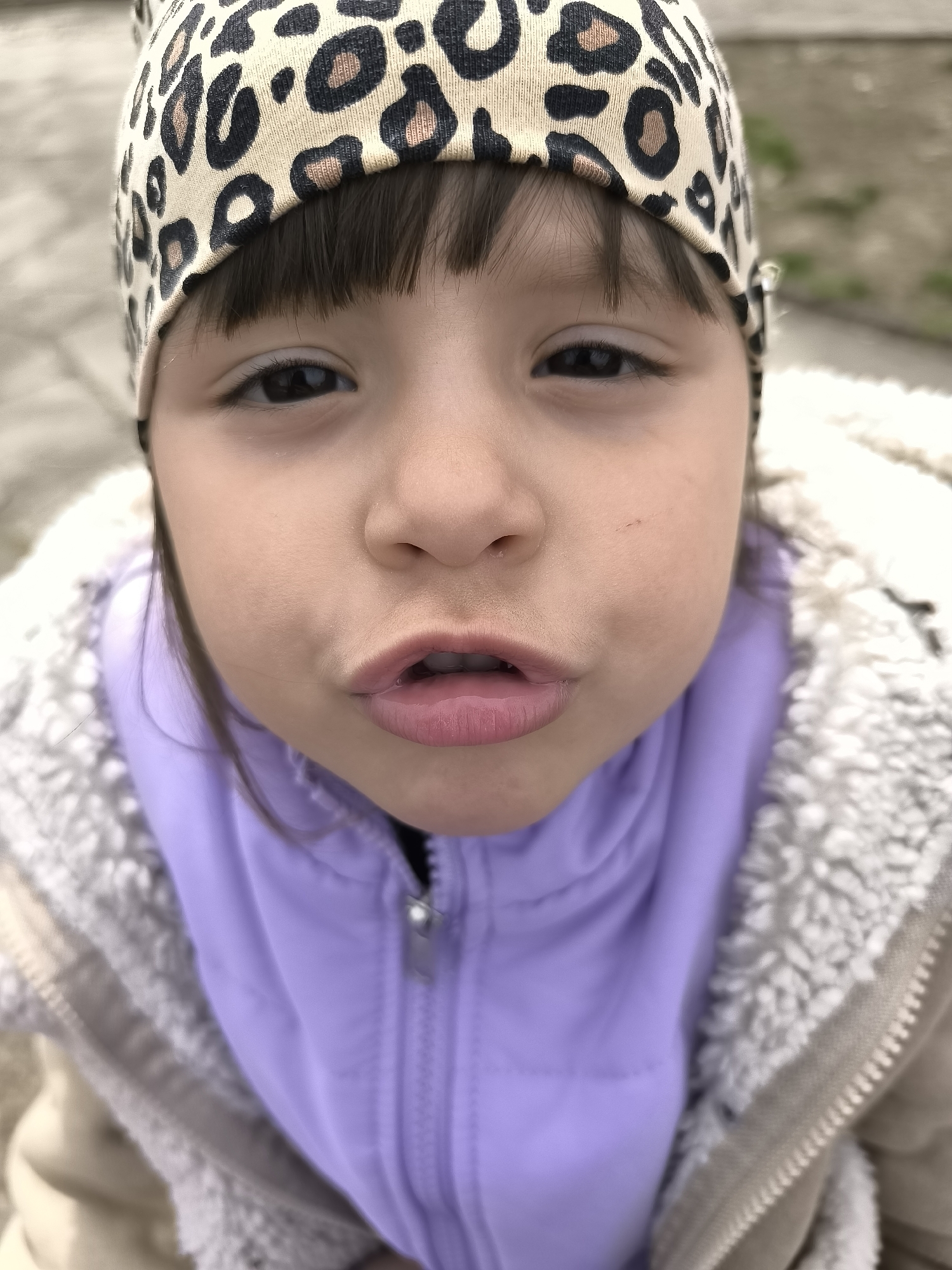 A close-up, head-on shot of a young girl with dark hair and brown eyes. She is wearing a leopard-print beanie and a purple jacket with a cream-colored, sherpa-lined coat over it. Her lips are slightly pursed. The background is blurred and indistinct, suggesting an outdoor setting. There is no evidence of the location being Pleven, Bulgaria.