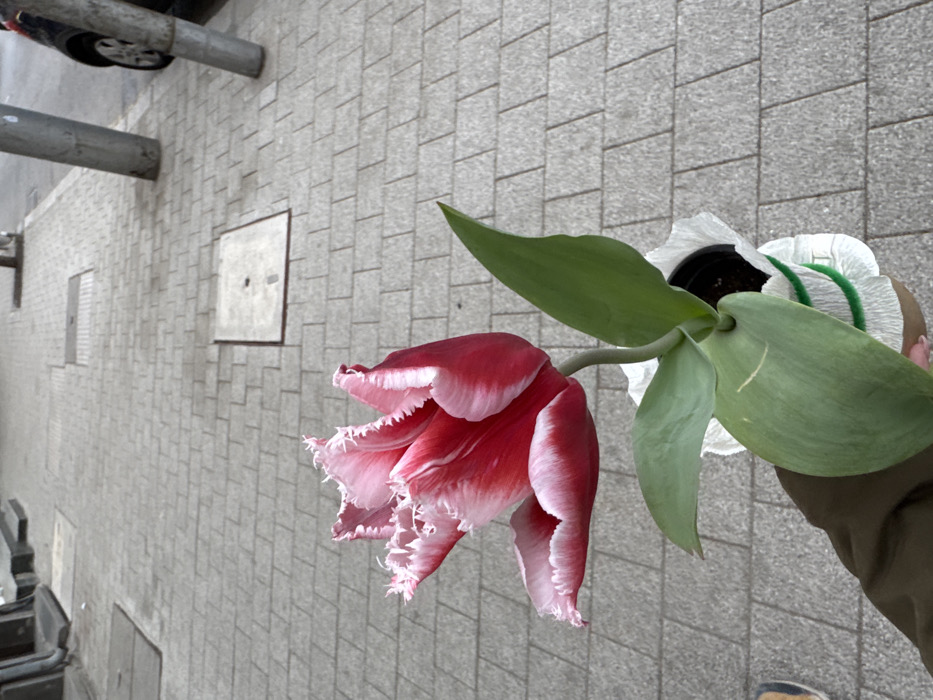 A hand, wearing a dark-colored sleeve, holds a potted fringed tulip over a paved sidewalk in Sofia, Bulgaria. The tulip displays a single, large bloom with red petals edged in white and a distinct fringed texture. Green leaves extend from the stem. The plant is contained in a black pot, which is wrapped in crinkled white paper secured by a green pipe cleaner-like band. The sidewalk is constructed from light grey rectangular pavers and features several square metal utility covers. In the background, to the right, two metal poles and a portion of a dark vehicle's wheel and fender are visible. To the far left, dark, indistinct building elements are present. The scene is illuminated by ambient daylight.