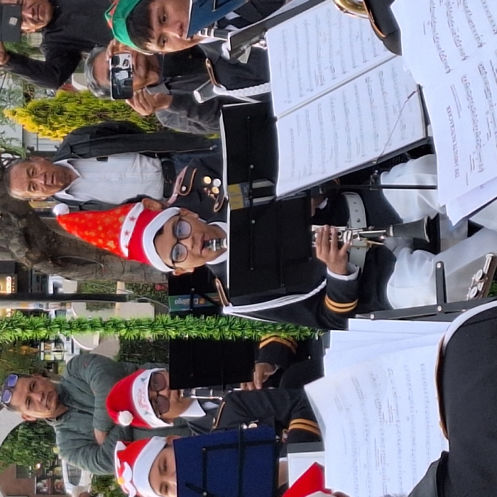 A group of musicians wearing Santa hats and band uniforms are playing instruments and reading sheet music outdoors. One musician has a red and white Santa hat with yellow stars. Several onlookers are present, including a man in a leather jacket and a person taking a photograph. Greenery and foliage are in the background.