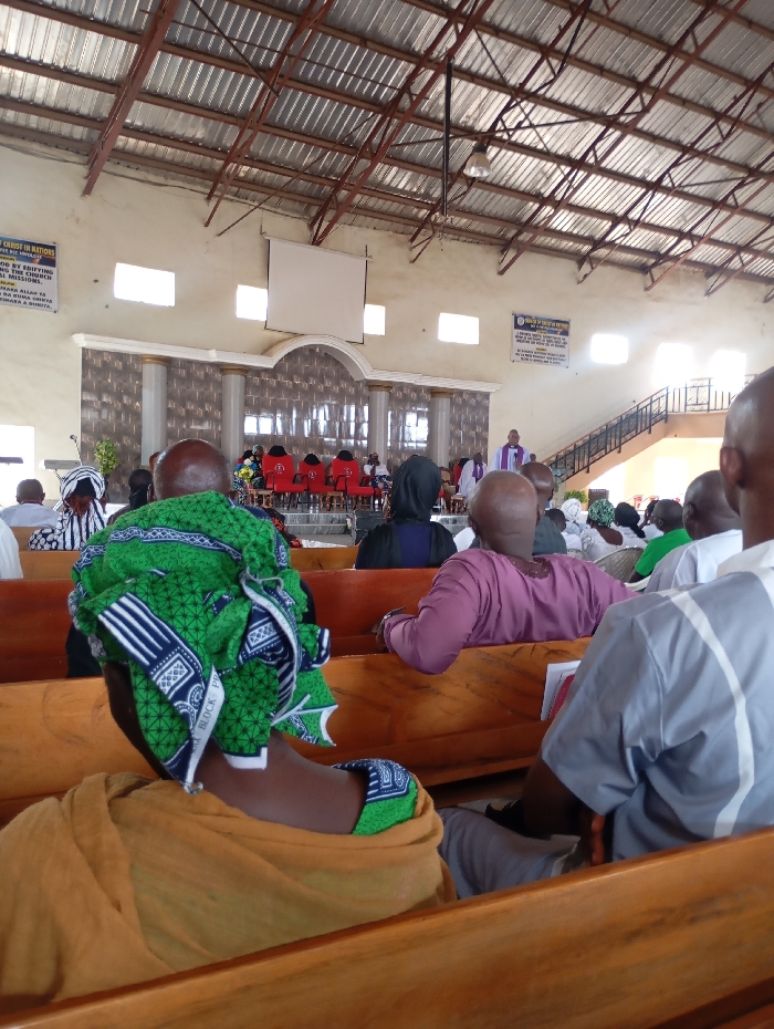 This image depicts the interior of a religious facility in Jos, Nigeria, during what appears to be a service or gathering. The perspective is from the rear of the congregation, looking towards a raised platform or altar. In the foreground, the back of several individuals seated on light brown wooden pews is visible. Prominently featured on the left is a person wearing a green and white patterned headwrap and a mustard-yellow garment. To their right, the back of a man wearing a grey short-sleeved shirt with vertical white stripes is seen, also seated on a wooden pew. A red booklet or hymnal rests on the pew in front of him. The midground shows multiple rows of attendees, primarily seen from behind or the side, occupying the wooden pews. Many individuals have bald or closely shaved heads. Further back, a person in a purple garment is visible amongst the seated crowd. The background features a raised platform serving as the focal point. This platform has a decorative back wall with two white fluted columns and a central arched section with a dark, textured pattern. Five red upholstered chairs are arranged on this platform. To the right of these chairs, a figure in a purple liturgical vestment (chasuble) over a white garment (alb) stands, facing the unseen congregation. Above the platform, a large white projection screen is lowered. The hall has high, light-colored walls and a visible corrugated metal roof supported by exposed metal trusses. Multiple rectangular windows are high on the walls, admitting natural light. Two banners with text are affixed to the walls: one on the left mentioning "CHRIST IN NATIONS" and "EDIFYING," and another on the right with additional English text. On the far right, a metal-railed staircase ascends.