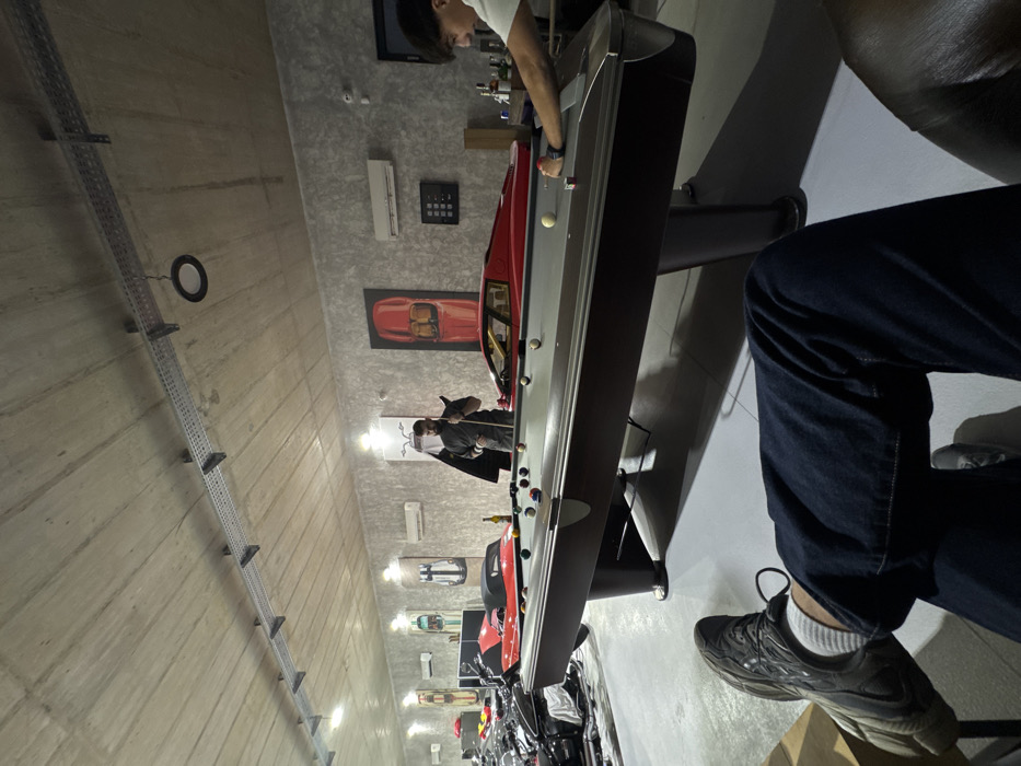 The scene is an interior view of a spacious garage or private recreational area in Ivanyane, Bulgaria, designed with an industrial aesthetic and displaying luxury vehicles. In the immediate foreground, the lower legs and feet of a seated individual are visible, wearing dark blue jeans, white socks, and dark grey athletic shoes. A brown-framed pool table with a grey playing surface dominates the midground, with several colored pool balls and one white cue ball scattered across it. Two men are actively engaged in playing pool. The first man, positioned on the left side of the table, has a dark beard and wears dark attire; he holds a pool cue vertically and observes the table. A green bottle is visible on the edge of the pool table near him. The second man, positioned on the right side of the table, has short dark hair and wears a white t-shirt; he leans over the table, preparing to strike a cue ball with his pool cue, his left hand braced on the table. In the background, multiple high-performance vehicles are visible. To the left, a red convertible sports car (e.g., a Ferrari F430 Spider) with its top down is parked alongside several motorcycles, some partially covered with dark material. To the right, behind the pool table, a red sports car (e.g., a Ferrari F40) is prominently displayed. The walls are a textured light grey, possibly concrete or stucco, adorned with multiple framed artworks depicting various luxury cars. Two white wall-mounted air conditioning units are present, along with a black electrical panel or keypad. The unpainted concrete ceiling features exposed industrial metal cable trays or conduits running horizontally, equipped with recessed circular light fixtures and additional spotlights illuminating the walls and vehicles. The floor is a smooth, light grey concrete surface.