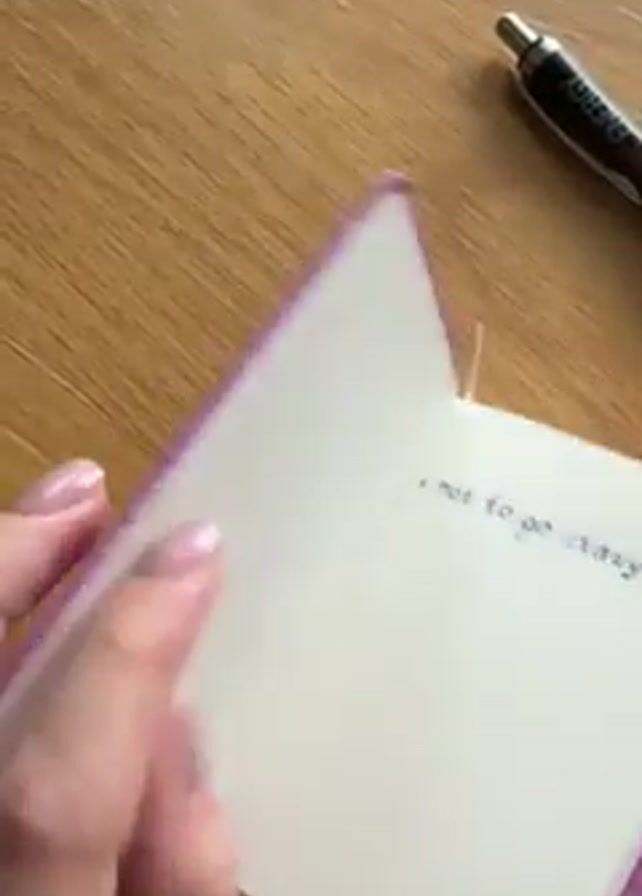 small, purple, suede-like notebook with "2026" printed in gold on the cover, lying on a wooden table next to a pen. A hand opens the notebook to reveal a page with the handwritten text "1. not to go crazy" in blue ink. The hand points to the text on the page.
