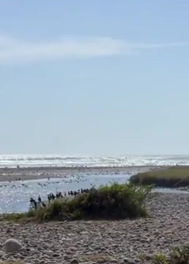 view of a beach, with many birds clustered in the water where a river meets the ocean. The foreground is a rocky area with some green bushes. The ocean waves can be seen in the distance under a clear, blue sky with some scattered clouds.