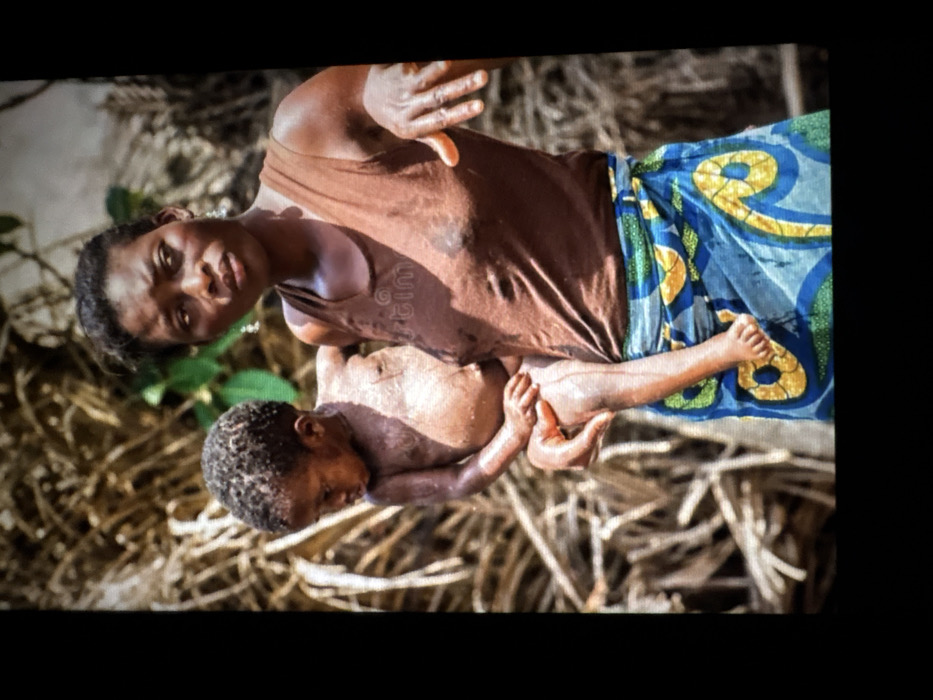 A woman holds a baby. The woman, wearing a brown tank top and a colorful blue and yellow patterned cloth, looks directly at the viewer. She supports the child, who is skin-to-skin, in her arms. The background is indistinct, appearing to be natural with dried plant matter. The image is slightly angled to the right.