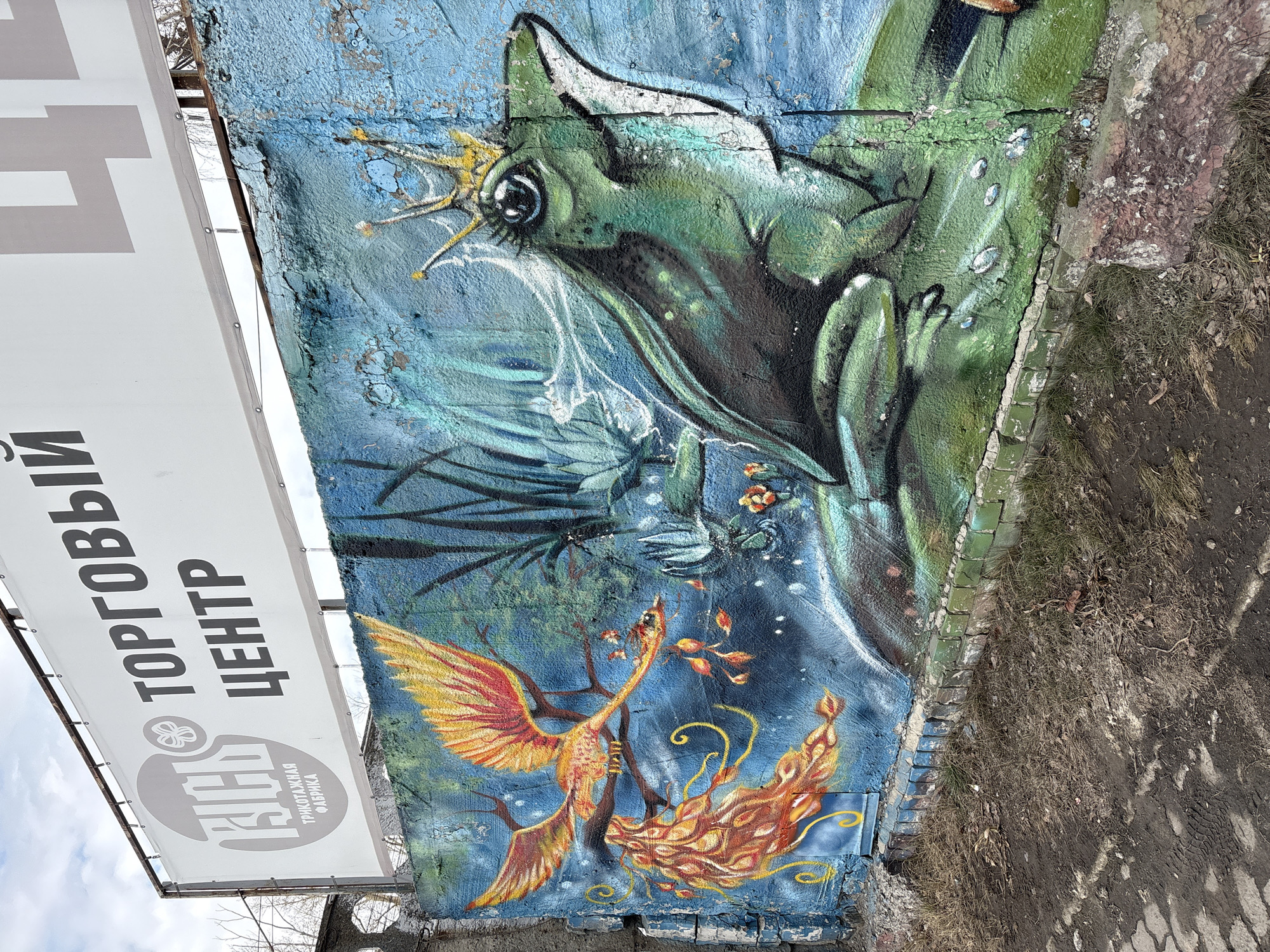 The image depicts a vibrant mural in Ulyanovsk, Russia, featuring a frog wearing a crown and a phoenix-like bird engulfed in flames. The mural is painted on a textured blue wall, with signs of weathering and cracking. A white sign with black Cyrillic lettering is positioned adjacent to the mural. The ground near the wall is covered in dirt and dry grass.