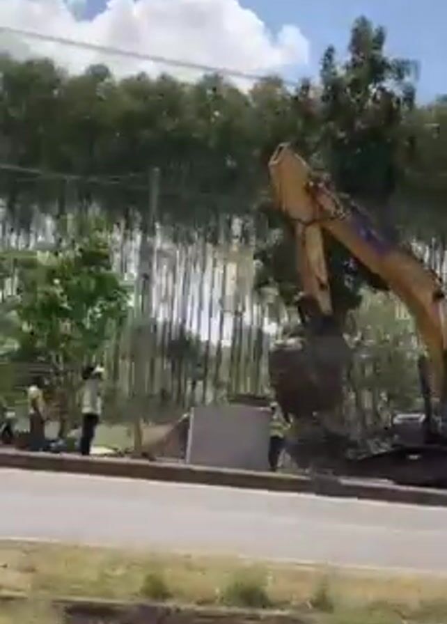 road under construction on a clear, sunny day with some white, puffy clouds. Along the roadside, there is a line of tall, slender trees and some other greenery. A yellow excavator is working on the site, moving large concrete blocks. Several construction workers in light-colored shirts are visible around the excavator. The camera appears to be moving in a vehicle along the road.