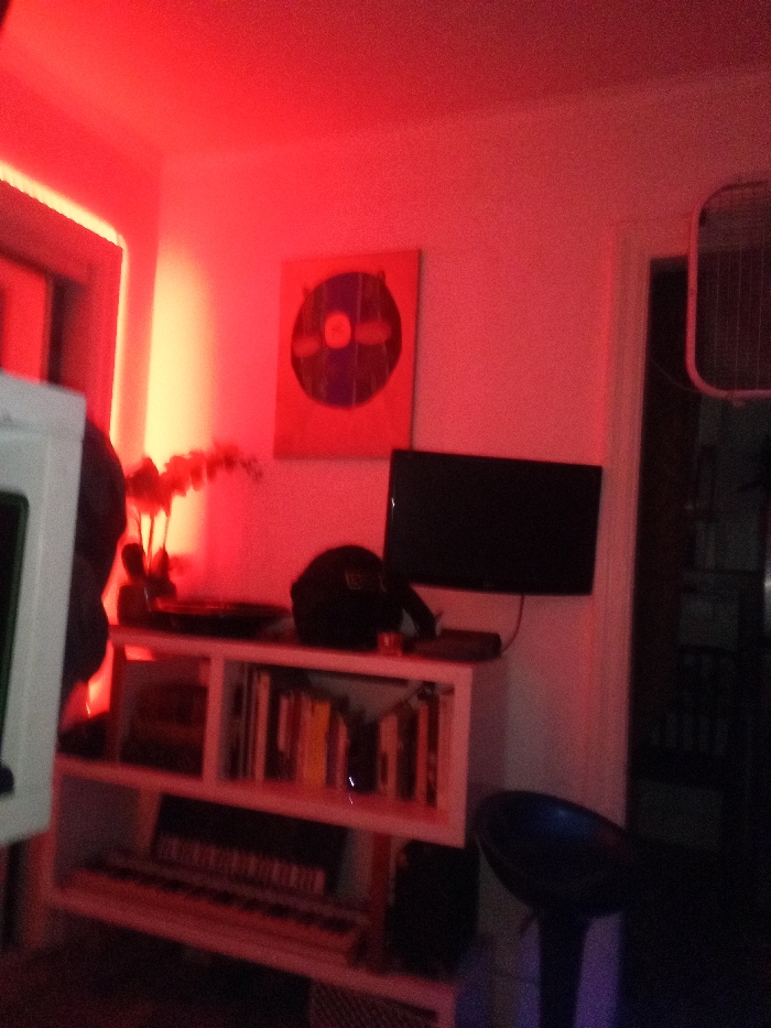 - "The scene depicts an interior room illuminated by a pervasive red ambient light, originating from sources including a red LED strip along the ceiling-wall junction on the left and a localized warmer light source behind a decorative plant arrangement" by FM-Hjusx2, licensed under CC BY 4.0