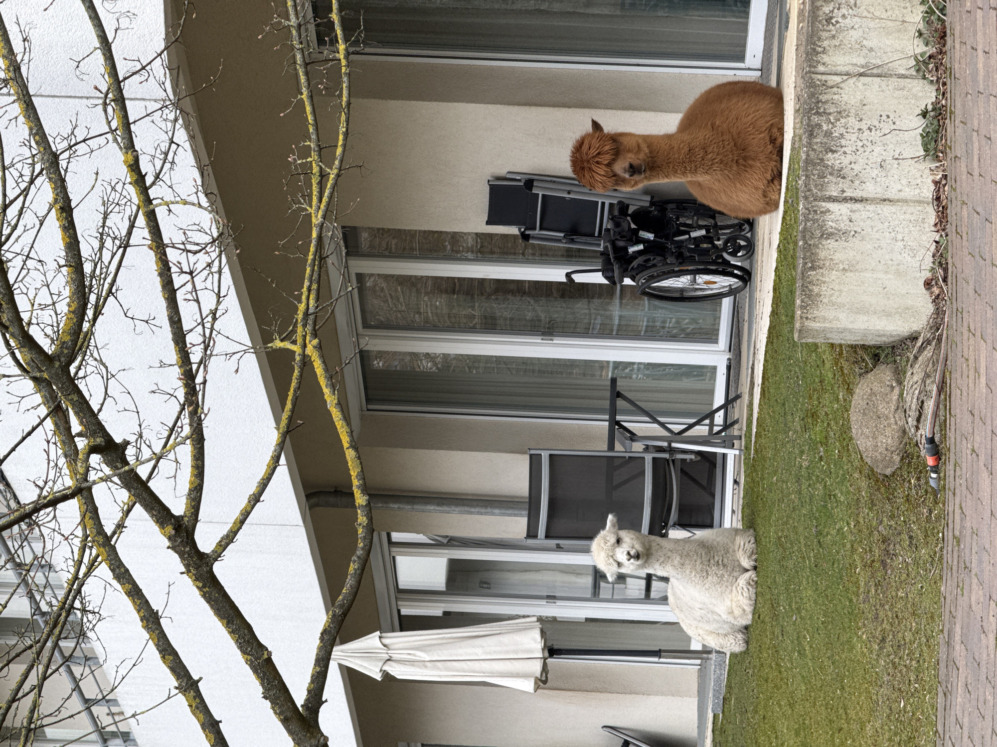 The scene features two alpacas, one brown and one white, resting on a grassy area adjacent to a building. A wheelchair and folded chairs are positioned near the brown alpaca, suggesting a residential setting with accessibility considerations. A tree with sparse foliage frames the left side of the image. The architectural style of the building and the landscaping details indicate a European location, potentially in Berlin, Germany, given the user's prompt. A stone and a garden hose are near the edge of a brick walkway.