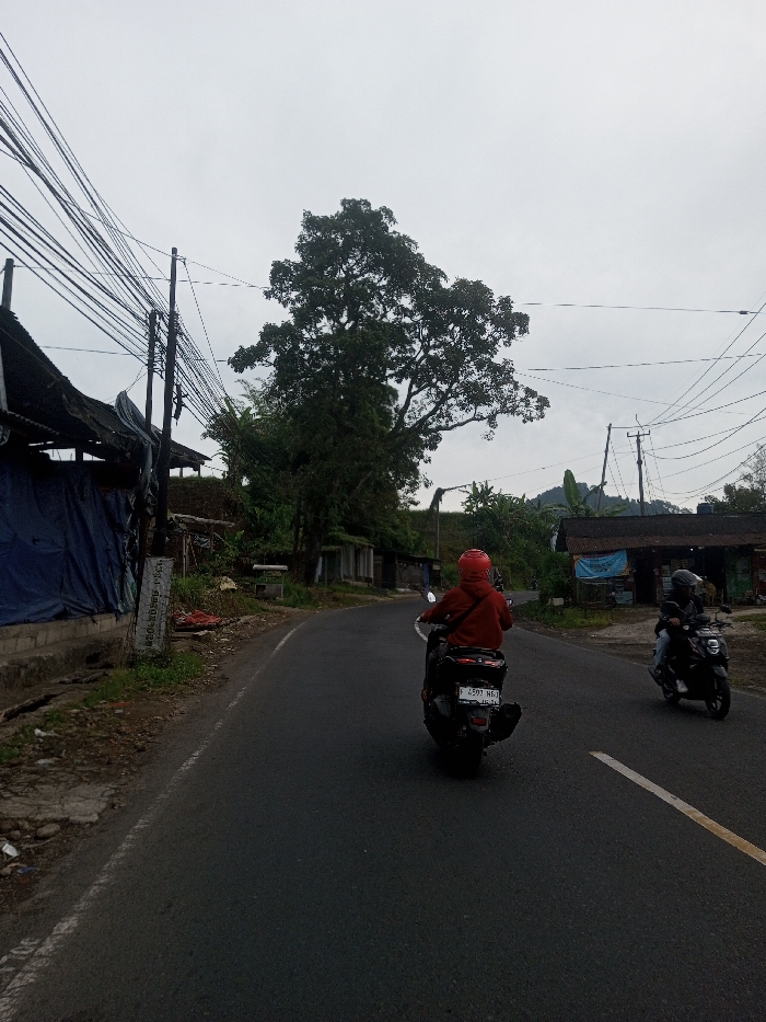 The image depicts a street scene in the city of Sat Thay (East), Myanmar, under an overcast sky. Two individuals are operating motorcycles on a dark asphalt road that curves slightly to the right, moving away from the viewer. The primary motorcyclist in the foreground wears a red helmet and a red hooded jacket, riding a dark scooter with the visible license plate F 4507 MBG. A second motorcyclist, wearing a dark helmet and dark clothing, is visible further ahead on the right side of the road, riding a dark motorcycle. The road features a solid white line marking the right shoulder and a broken white center line further in the distance. On the left side of the road, multiple black power lines are densely strung between several utility poles. Behind these poles, a structure is partially covered by a dark blue tarp, adjacent to a weathered white sign post. Beyond this, an earthen mound with sparse vegetation rises, and small, simple structures with corrugated roofs are visible. A large, prominent tree with dense green foliage stands behind the structures on the left, near the center of the image. On the right side of the road, a building with a dark corrugated roof displays a light blue tarp or banner on its front facade. Further in the background on the right, additional structures and green hills are visible. The overall environment suggests a semi-rural or village setting with typical local infrastructure.