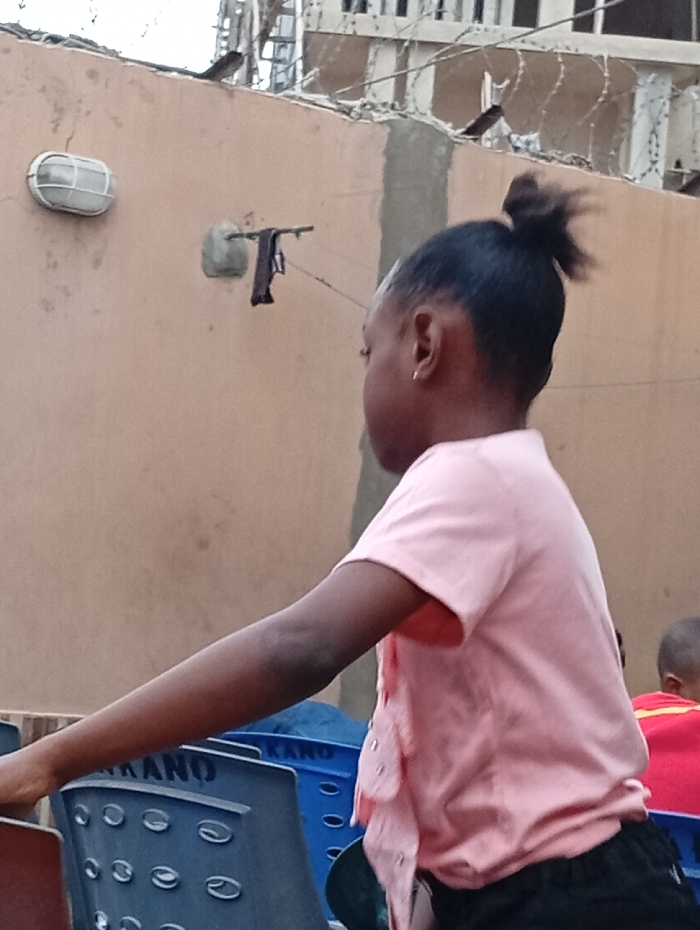 A young girl with a high bun faces away. She wears a pink top and black bottoms, with her arm extended. The background shows a beige building with a light fixture and a rod with cloth hanging from it. Barbed wire sits atop the building. In the foreground, chairs are visible, some with the text "KANO" printed on them. Another child wearing red is partially visible.