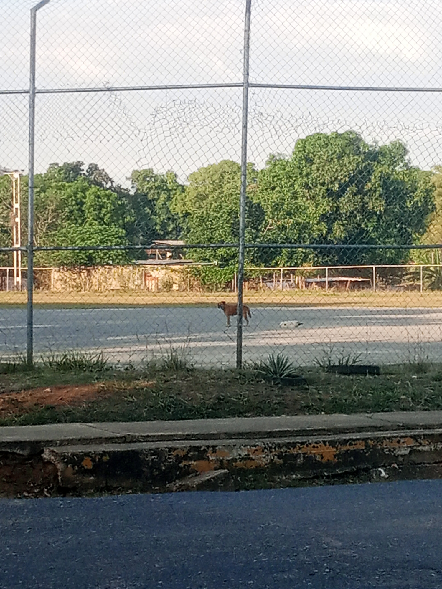 A medium shot captures a scene behind a chain-link fence, likely in Caño de Indio, Venezuela, given the prompt. A tan-colored dog stands in the middle ground, positioned on what appears to be a track or open, paved area. Behind the dog, some smaller objects, possibly a second dog or debris, are visible. The background reveals a sparse collection of buildings and lush, green trees, suggesting a semi-urban or rural environment. The foreground features a curb or low wall that is painted with yellow markings and has signs of wear. The road is in the immediate foreground. The lighting indicates it is daytime. The fence, slightly damaged in some spots, creates a physical barrier between the viewer and the main scene, partially obscuring the view.