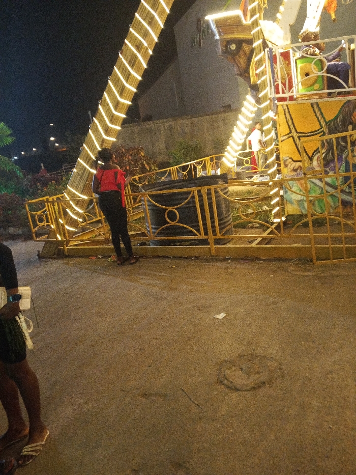 A night scene captures a lit-up carnival ride, its structure outlined by bright, thin lights. A woman wearing a red shirt and black pants stands near the ride's yellow guardrails. In the foreground, a person's legs and sandals are visible. The ground appears to be paved, with a visible circular patch. The lighting suggests an amusement park or fair environment.