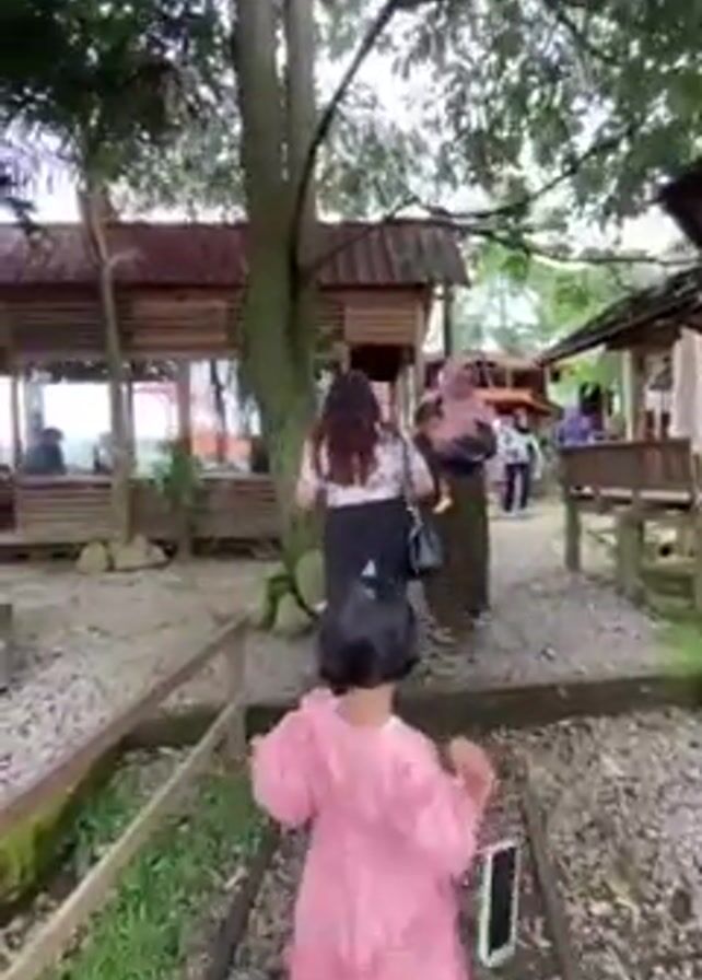 family walking through an outdoor area with wooden buildings. The camera follows a young girl in a pink dress as she walks ahead of two women. One woman is wearing a black-and-white top and the other is wearing a hijab and holding a baby. The area is decorated with trees, rocks, and wooden tables and chairs. People are sitting in some of the wooden buildings. The sky is overcast.