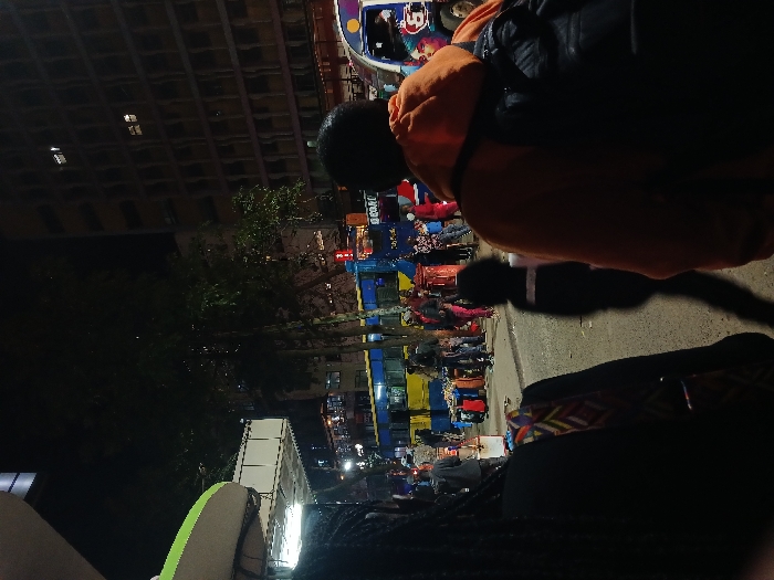 group of people standing on a street in Nairobi, Kenya, at the coordinates -1.284, 36.825. It is nighttime and the streetlights illuminate the scene. A large, blue and yellow bus is parked in the middle of the street. Some people are standing in front of it, and others are walking past. One person is wearing an orange hoodie and a black backpack and facing away from the camera. The scene is lit by streetlights and the bus’s headlights, and the tall buildings in the background create an urban backdrop.