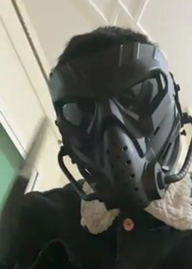 person wearing a black, futuristic-looking mask with clear goggles, breathing tubes, and perforated lower section