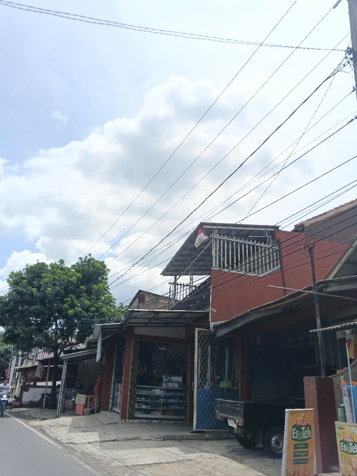 A street view shows a row of buildings, the closest being a red two-story structure with a metal balcony. Below is a shop, possibly a pharmacy based on the shelf display. A black pickup truck is partially visible in front. Further down the street are other similar businesses with trees lining the road. Overhead, a tangled web of utility lines cuts across the sky, contrasting with the partly cloudy sky above.