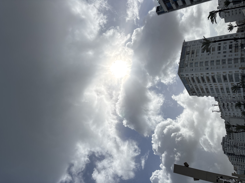 The image displays an upward-angled view of an urban environment in Tangier, Morocco, consistent with the architecture found along Boulevard Mohammed VI or similar coastal areas. The sky occupies approximately two-thirds of the frame, showing a dynamic mix of bright white cumulus clouds and darker grey stratocumulus formations. The sun is centrally positioned behind a partial cloud cover in the upper-middle, emitting a strong, bright light with visible rays. Patches of clear blue sky are visible between the clouds. In the lower third of the image, multiple multi-story buildings are visible. The most prominent structure is a tall, white building with numerous balconies and a flat roof, located in the right-center. To its left, a row of interconnected white buildings of varying heights extends across the lower-middle, featuring multiple windows and some rooftop equipment, including antennae. A large, angular, light-colored vertical structure, possibly a modern architectural element or a large lamppost, is partially visible on the far left. Several slender palm trees with dark fronds are interspersed among the buildings in the lower-middle and lower-right portions of the frame. No people, discernible subjects, explicit actions, or interactions are visible within the scene. The environment is urban and illuminated by natural daylight.