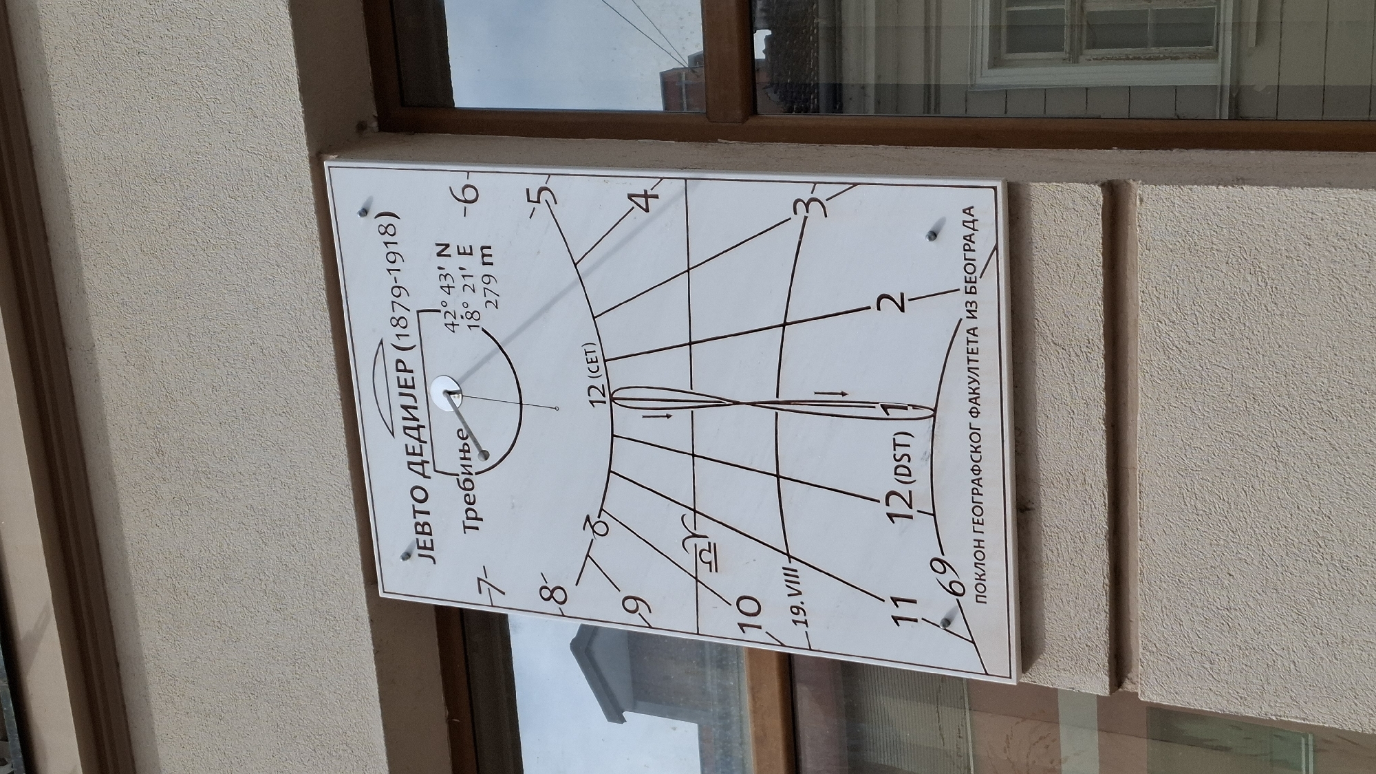 A white rectangular sundial plaque is affixed to a textured, light beige building wall. A metallic gnomon projects perpendicularly from the plaque's center. The plaque's surface displays black lines indicating hours from approximately 7 AM to 6 PM, with numbers 1 through 12 marking the time. One set of 12 o'clock is labeled "12 (CET)", and another set is labeled "12 (DST)". A specific date line is marked "19. VIII" (August 19th) with a Libra symbol. Inscriptions on the plaque are in Serbian Cyrillic and Latin script. At the top, "JЕВТО ДЕДИЈЕР (1879-1918)" is prominently displayed. Below this, "Требиње" is written, indicating the city of Trebinje, Bosnia and Herzegovina. Corresponding geographical coordinates are listed as "42° 43' N", "18° 21' E", and an altitude of "279 m". The bottom of the plaque states "ПОКЛОН ГЕОГРАФСКОГ ФАКУЛТЕТА ИЗ БЕОГРАДА" (Gift from the Faculty of Geography from Belgrade). The sundial is mounted slightly below an architectural overhang. To the right, a brown-framed window is visible, reflecting a distorted image of an adjacent building and sky. To the left, another window reflects a similar urban and sky view. The wall texture consists of small, uniform protrusions.