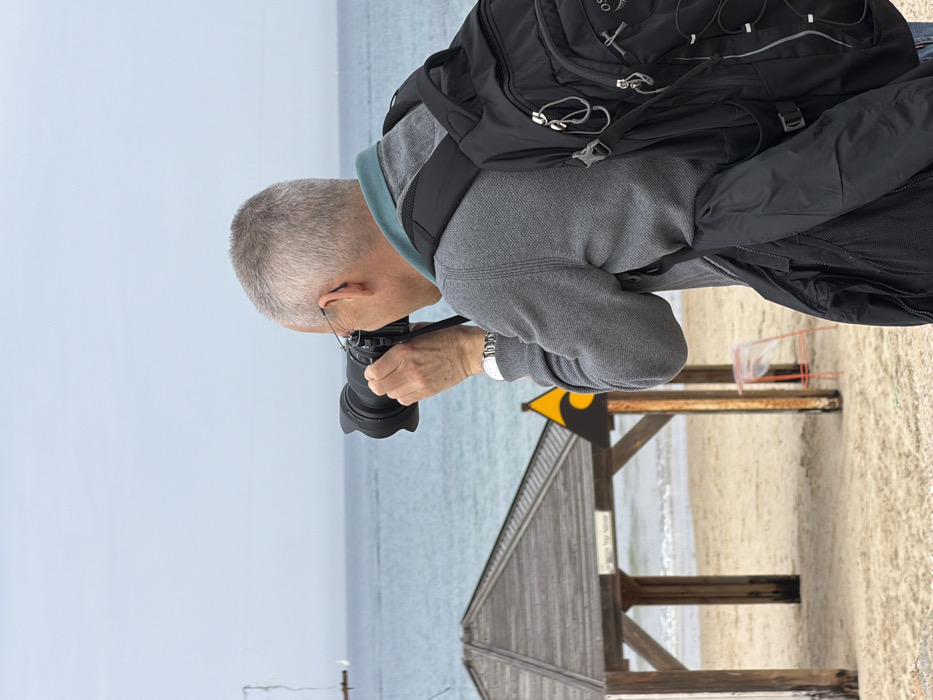 An individual, appearing male, with short gray hair and wearing glasses, is photographed from behind and the right side, actively looking through the viewfinder of a black DSLR camera fitted with a large black lens