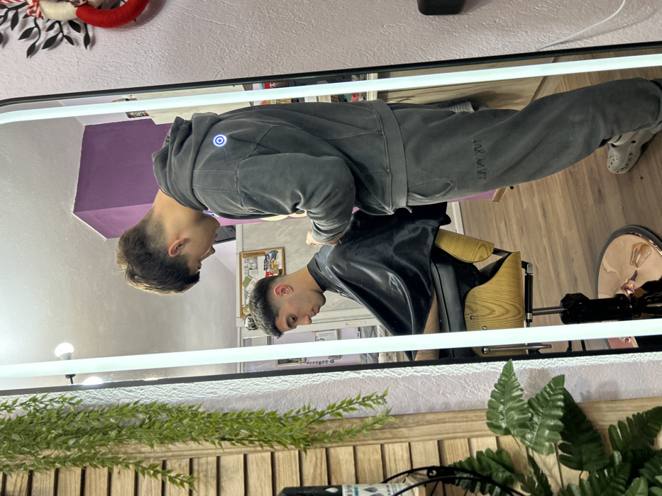 The scene is set inside a hair salon or barbershop located in Sliven, Bulgaria. The image, captured through a large, rectangular mirror with vertical LED strip lighting, depicts a male barber actively cutting the hair of a male client. The barber stands to the right of the client, positioned behind him, and wears a dark grey hooded sweatshirt with a circular, light-colored logo on the upper back, dark grey sweatpants featuring text on the left thigh, and white Crocs. He is leaning forward, focused on the client's hair. The client is seated in a black barber chair with wooden side panels and a rose gold/copper-finished hydraulic base. He is draped in a black barber cape and has a fresh fade haircut on the sides, with longer hair on top. His head is slightly bowed. The environment visible includes a wall to the left of the mirror featuring horizontal wooden slat paneling and a long, cascading artificial green plant. Reflected in the mirror, the wall behind the client is painted purple and displays a framed picture. A red and white decorative object, possibly a wreath, is partially visible on the far right edge of the mirror. A black spray bottle is partially visible on a shelf on the far left. The flooring appears to be light-colored wood or laminate.