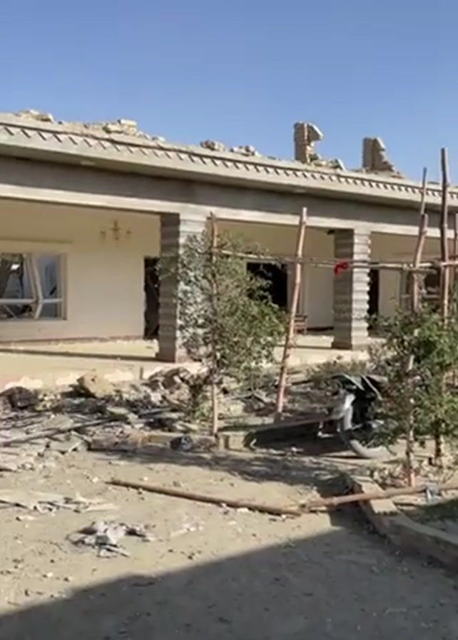 man standing in front of a damaged building. The building appears to have been damaged by an explosion or some other type of destructive event. There is debris scattered all around the building. The man is wearing a black suit and a green headscarf. He is looking at the camera and talking. The sky is blue and the sun is shining.