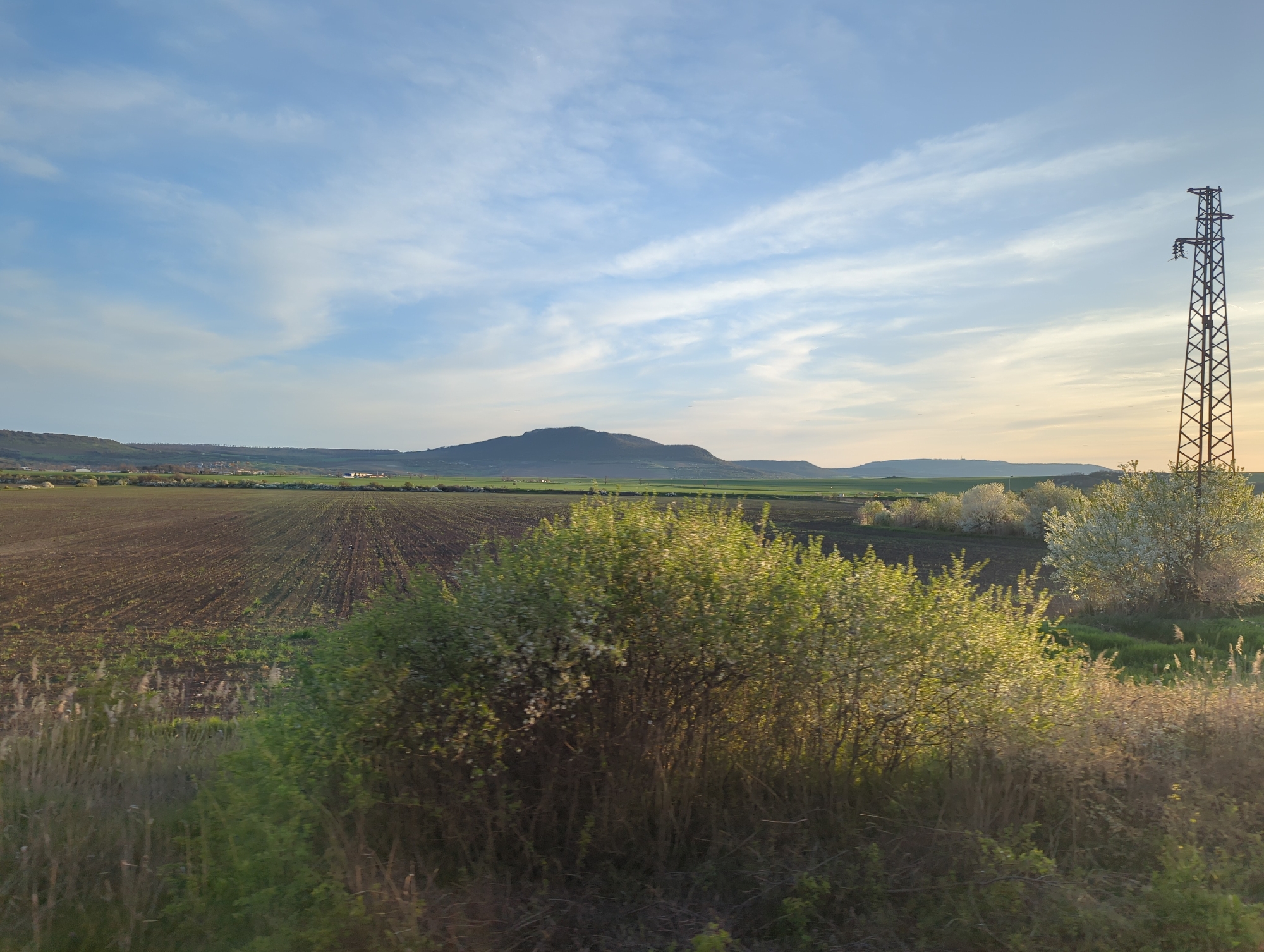 The image depicts a rural landscape in Jitnitsa, Bulgaria. A cultivated field occupies a significant portion of the scene. In the distance, a hill or mountain range is visible. In the foreground, bushes and trees line the edge of the field, with an electrical power tower standing to the right. The sky is partly cloudy.
