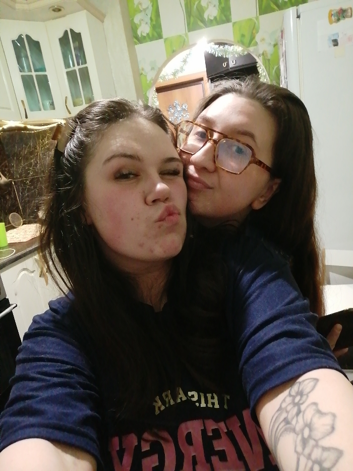 Two women pose closely together indoors. The woman on the left has dark hair, full lips puckered for a kiss, and light skin with some visible blemishes. The other woman, wearing glasses, snuggles close to her with a slight smile. Both wear dark, casual clothing. The woman on the right has a flower tattoo on her left arm. A kitchen with white cabinets and flowered wallpaper forms the background.