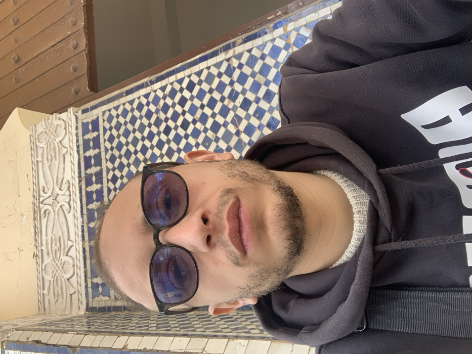 A male individual is depicted in a close-up portrait, looking directly at the viewer. He has light to medium skin, dark hair with a receding hairline, and a short beard and mustache. He wears dark-framed sunglasses with blue-tinted, reflective lenses. His attire includes a black hooded sweatshirt with partially visible white lettering (possibly "PUMA") and a light grey ribbed knit sweater underneath. A black strap, likely from a bag, is visible over his left shoulder. The background exhibits traditional Moroccan architectural elements, consistent with the city of Meknes, Morocco. These include a wall section adorned with blue and white geometric zellige tiles, arranged in a checkerboard pattern. Above the tiling, an intricately carved white plaster frieze with scrollwork and floral motifs is visible. To the upper right, a segment of dark brown wood, possibly a doorframe or beam, secured with visible metallic studs, completes the scene. The lighting suggests an outdoor or well-lit indoor setting.